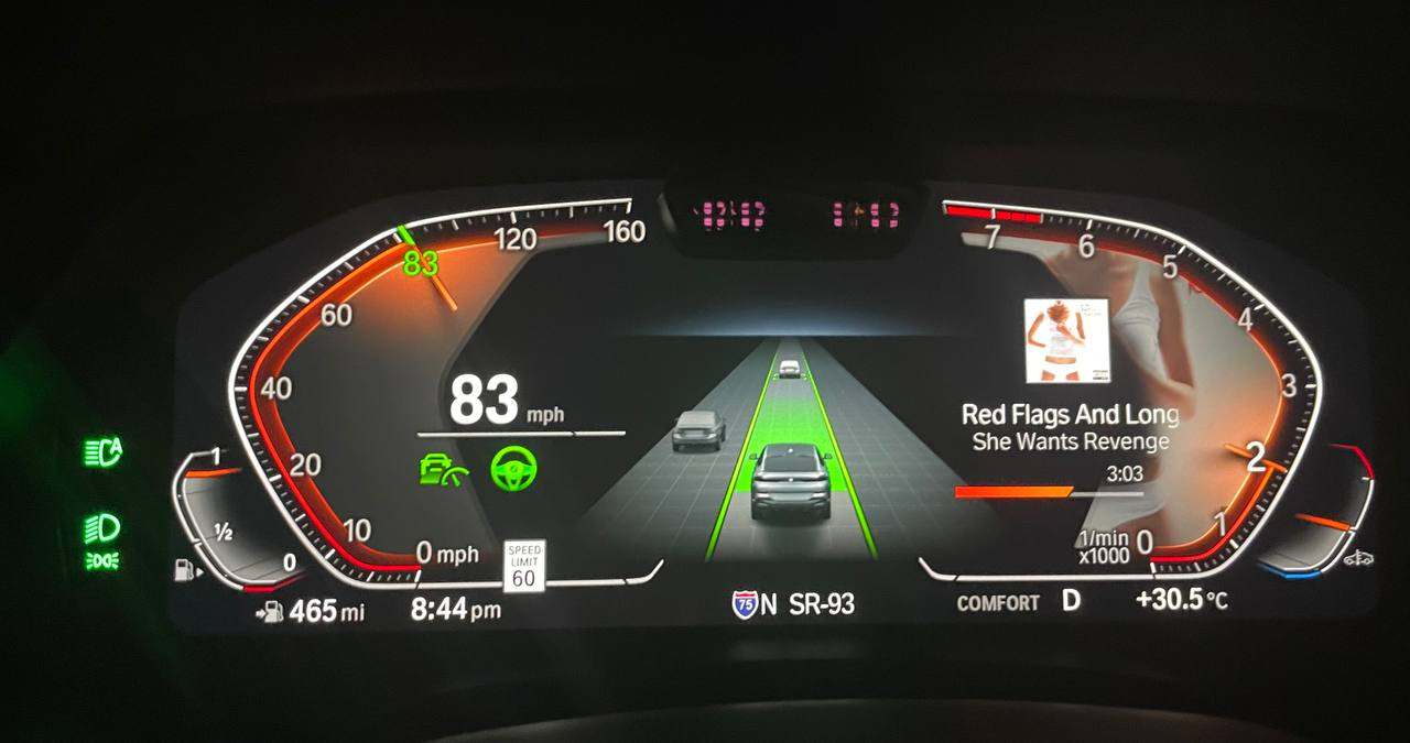 Мне очень нравится, как моя машина информирует меня о том, что она видит сенсорами, прямо на приборной панели. Картинка обновляется в реальном времени и показывает соседние машины и перемещения между полосами. Таким образом, если меня подрезал мотоциклист, я могу не сомневаться, что круиз-контроль его «увидел». Это даёт мне возможность чуть меньше напрягаться и держать ситуацию под контролем с меньшими усилиями. У Теслы очень похожий интерфейс, только со значительно бОльшим разрешением.