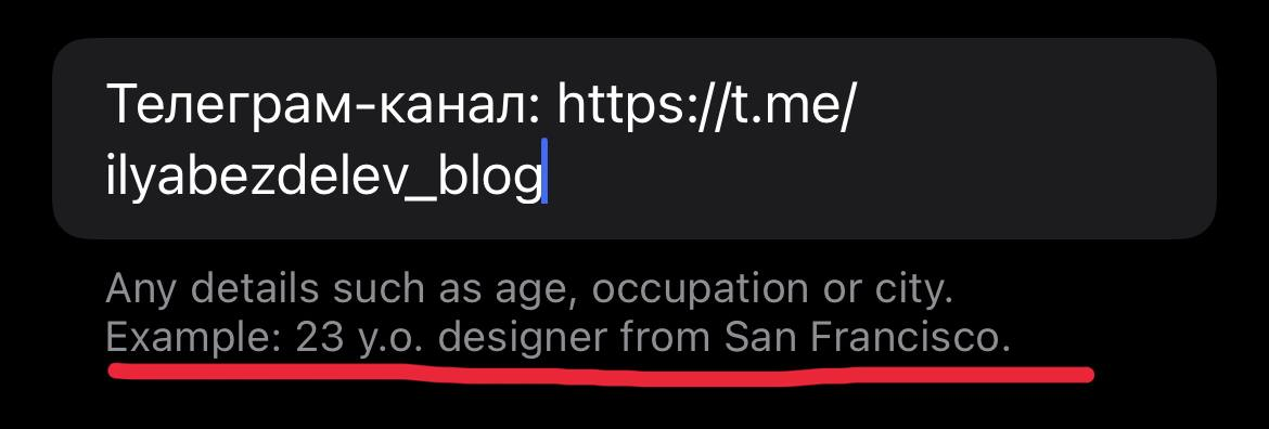 Для меня всегда было загадкой, почему люди в своих профилях в телеграмме в био пишут информацию как будто телега — это сайт знакомств.