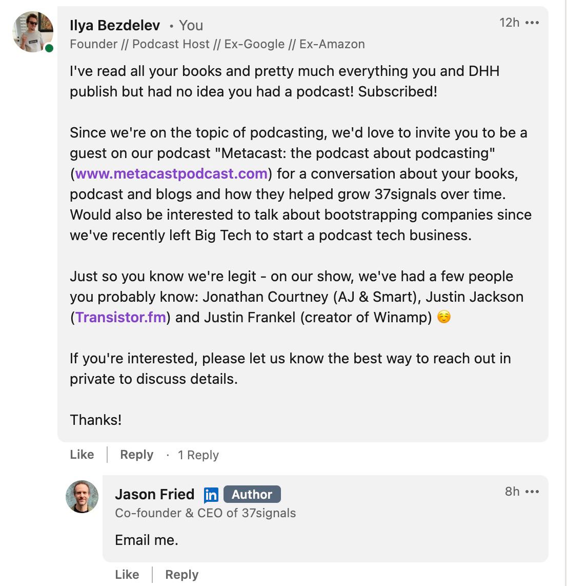 - Потом сразу к теме — приглашаем на подкаст. Не надо хоронить запрос после кучи воды. Воду можно добавить позже. Джейсон занятой человек, ему нужно понимать, что от него хотят.