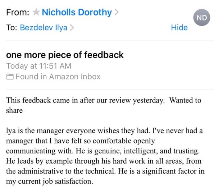 Отзыв обо мне в роли менеджере4 июля 2023 г.AmazonСмотрел фотки и нашёл вот что ❤️ 2017 год. Мелочь, а приятно. Комменты в Telegram