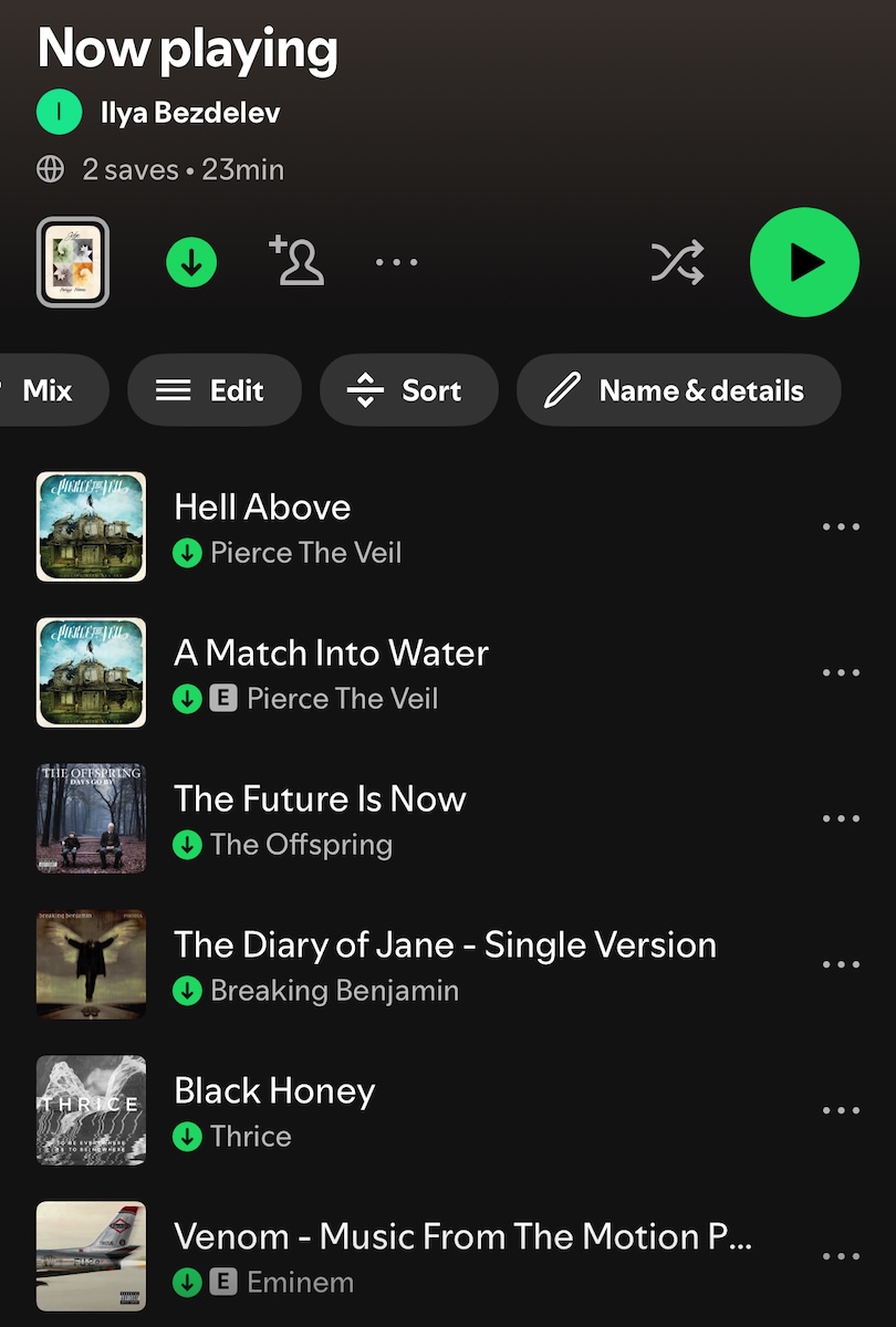 Для песен, которые в итоге зашли, у меня есть отдельный плейлист — My music over time. Туда я добавляю всё то, что могу слушать на повторе, и этот плейлист мы слушаем всей семьёй в машине, или я его просто включаю, когда хочу чего-то знакомого и любимого.