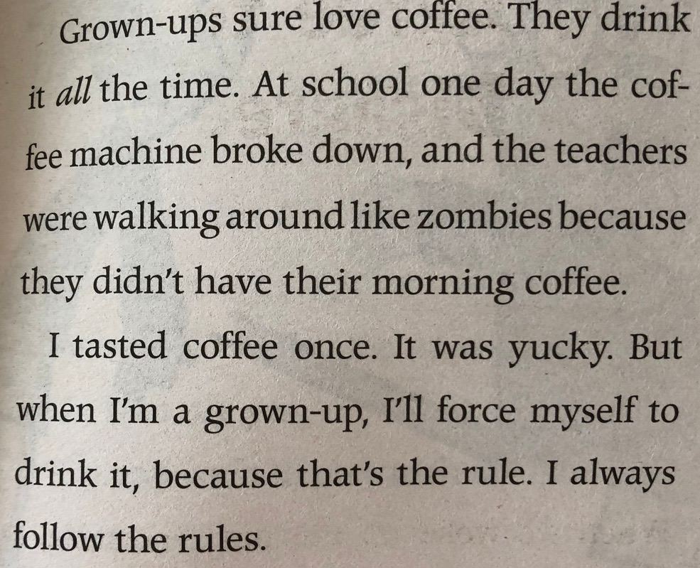 Как-то раз я попробовал кофе и оно было отвратительным на вкус. Но, когда я вырасту, я буду заставлять себя пить кофе, потому что такие правила. Я всегда подчиняюсь правилам.