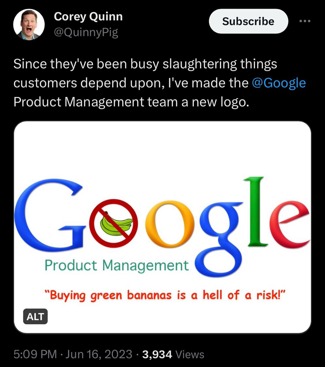 Пару дней назад Corey Quinn, инфлюенсер в сфере затрат на облачные ресурсы, разместил у себя твит, где логотипом продакт менеджмента Гугла были зелёные бананы. Многие в самом Гугле не слышали о зелёных бананах, сдаётся мне, что эта тема — табу, так как она вскрывает одну из главных дисфункций культуры компании. Я сам узнал о ней от старожилов.